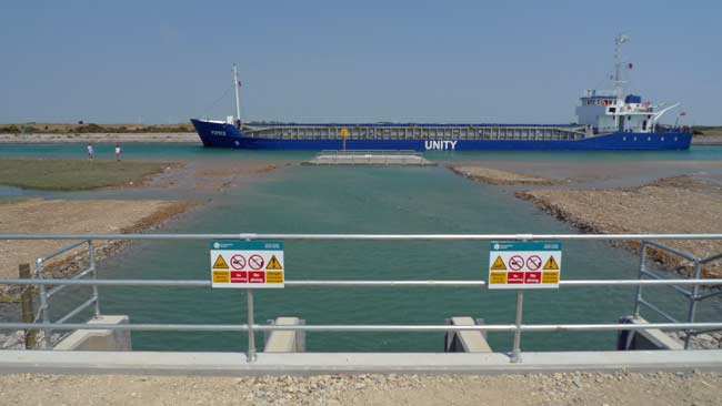 The coaster "Unity" comes in on a high tide past the new structures near Lime Kiln Cottage. In the foreground is the new culvert giving controlled access of the sea into and out of the new re-created saltmarsh. Beyond, with the yellow marker, is the new culvert for the RNLI access track beside the river.