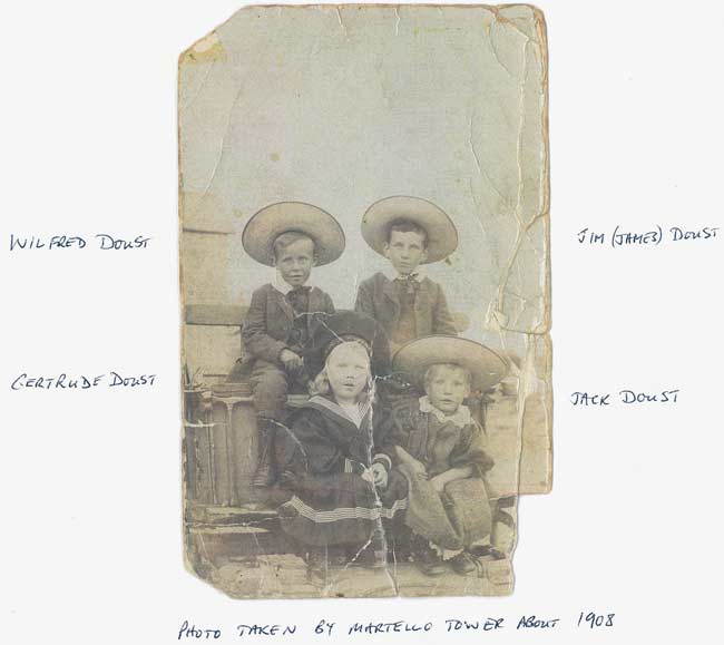 Young children photographed by Martello Tower about 1908. Jack Doust went on to become the Harbour Master.