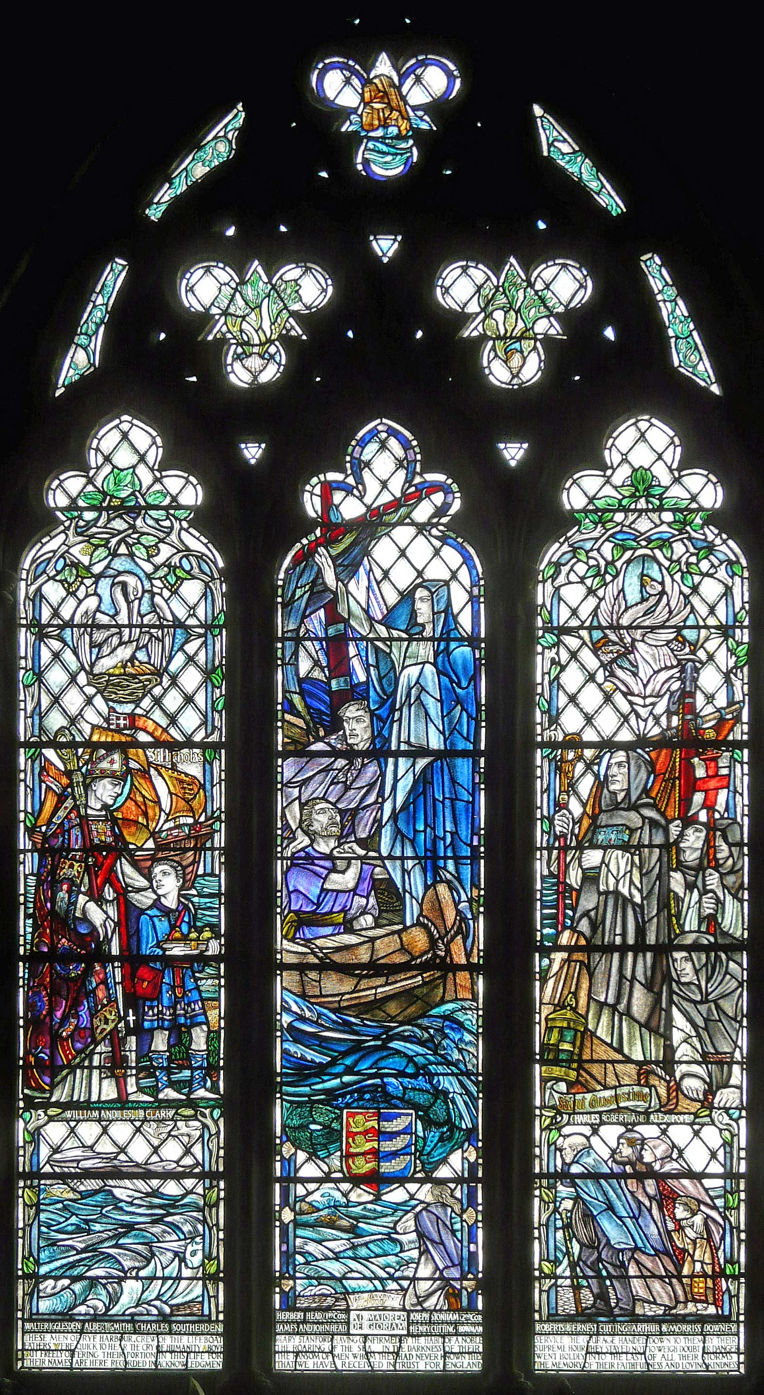 It can be seen at Winchelsea Church and was the work of Douglas Strachan Ll.D., H.R.S.A., an artist who designed windows in St Paul's Cathedral and Edinburgh Castle.