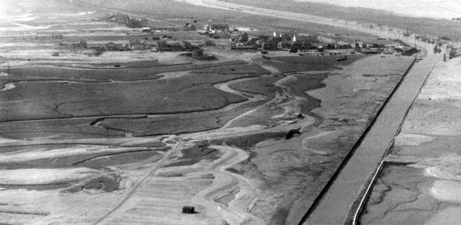 Locate the Martello Tower (top centre) and the red-roofed hut (bottom centre) and you can see how much the landscape around the village has changed. The extensive saltmarsh is being re-created by the Environment Agency - work started in Sept. 2010.
