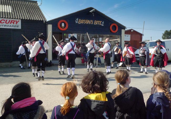 The Cinque Port Morrismen performing in the village on May Day watched by a class from Rye Primary School.